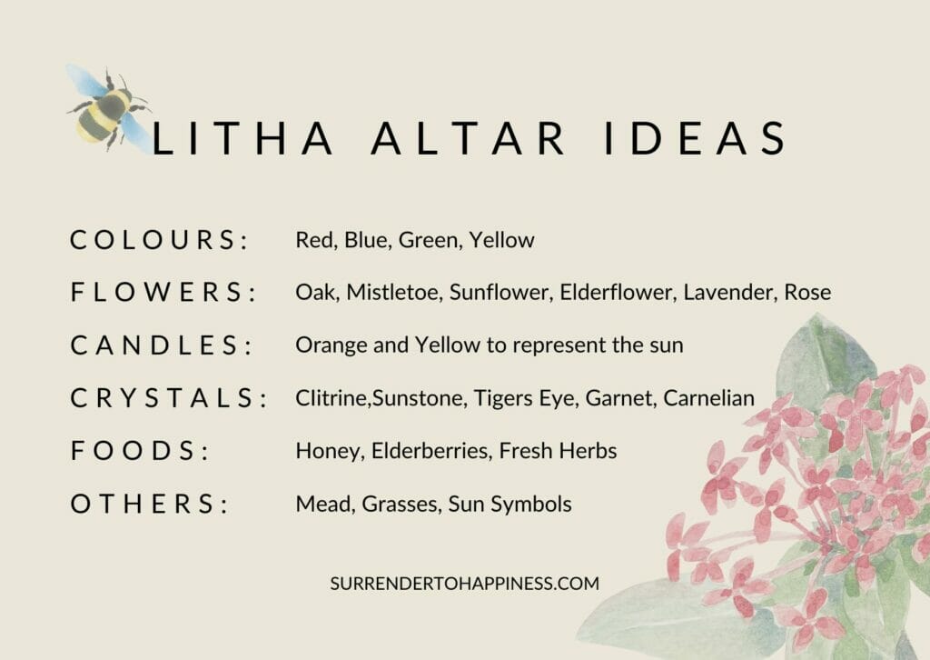 Since litha is a celebration of the sun, set up an altar outside. If this is not possible, set your altar by the window allowing the most sunlight. If you plan on using an altar cloth, choose bright summery greens or yellows, perhaps even a gingham fabric. Once you have the base of your altar ready, you can begin layering it with items that speak to you. Below is a printable list of decoration ideas (click on the picture to print).