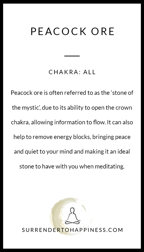 Peacock ore is often referred to as the ‘stone of the mystic’ due to its ability to open the crown chakra allowing information to flow.