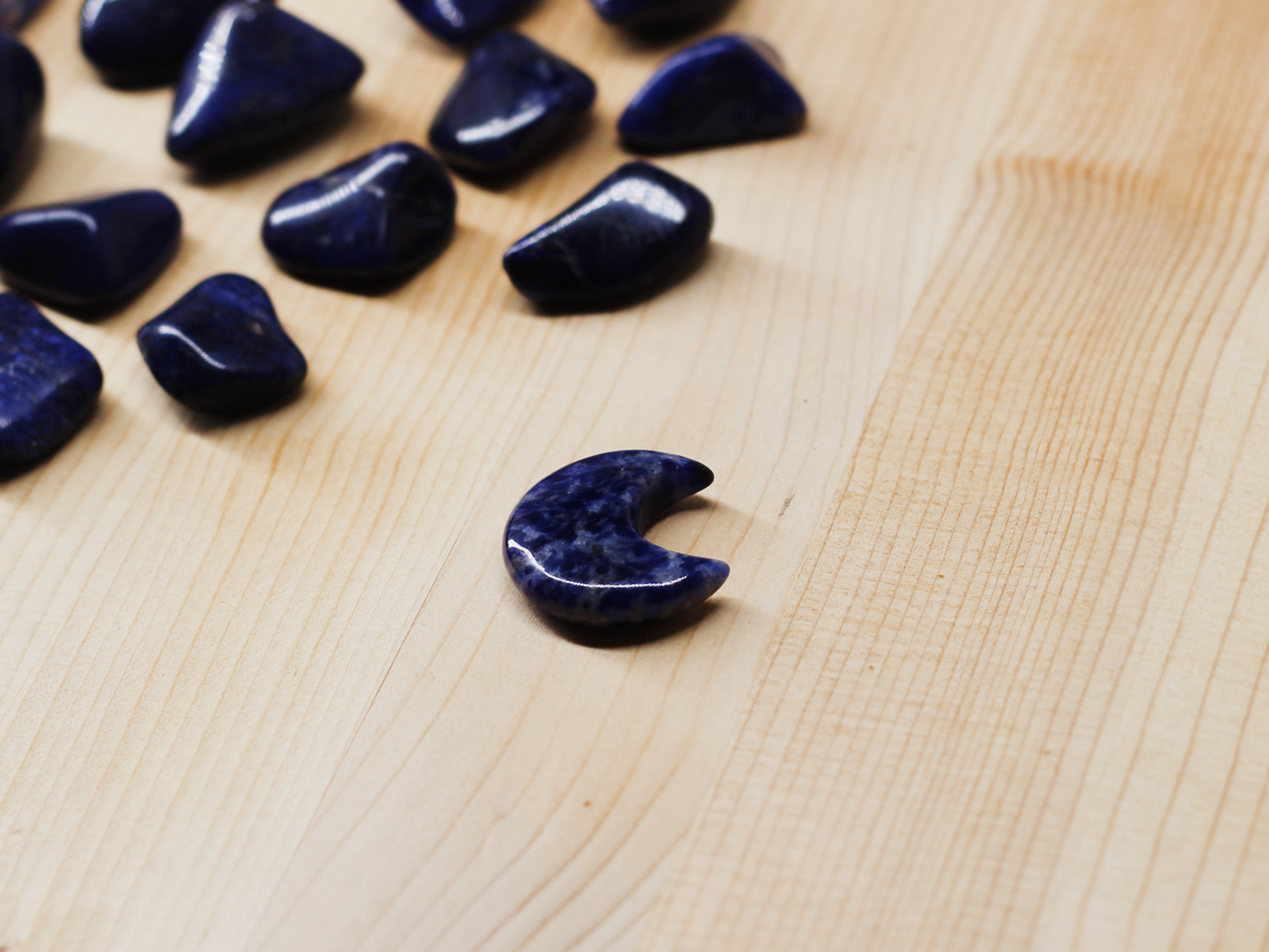 Each beautiful sodalite moon gives the appearance of a brooding sky; this comes from a combination of manganese and calcium.