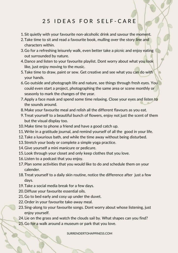 If you love listening to music, make a playlist full of your favourite uplifting songs and sit and listen to them. Better yet, move your body to it. Furthermore, if you need help with a few ideas, look at the printable list of self-care ideas from earlier. Whatever you need to refill your cup, put it on this list.